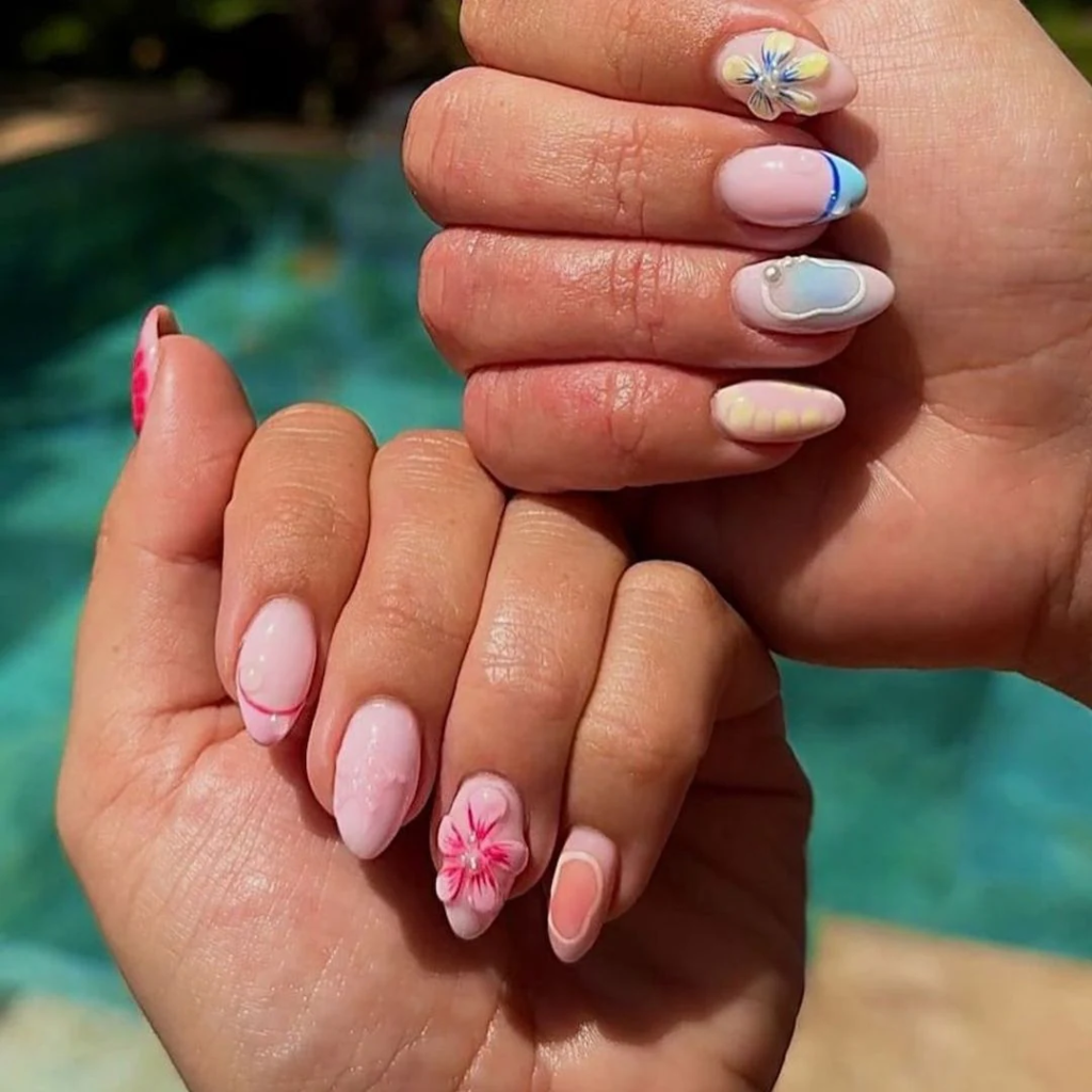 Palm trees, sunsets, and beach patterns enhance the uniqueness of your nails.