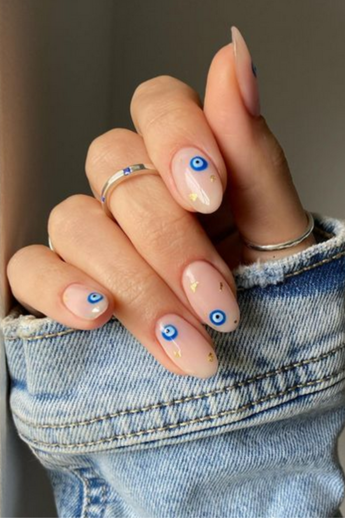 Milky white almond nails with a delicate blue evil eye accent – the perfect charm for beach days.