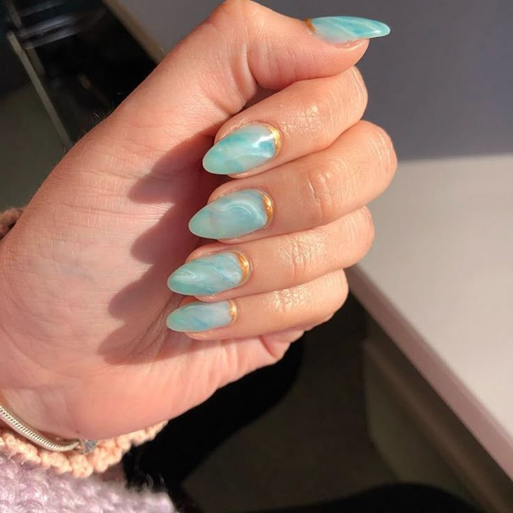 Dreamy light blue nails with white veining just like polished sea glass treasures.